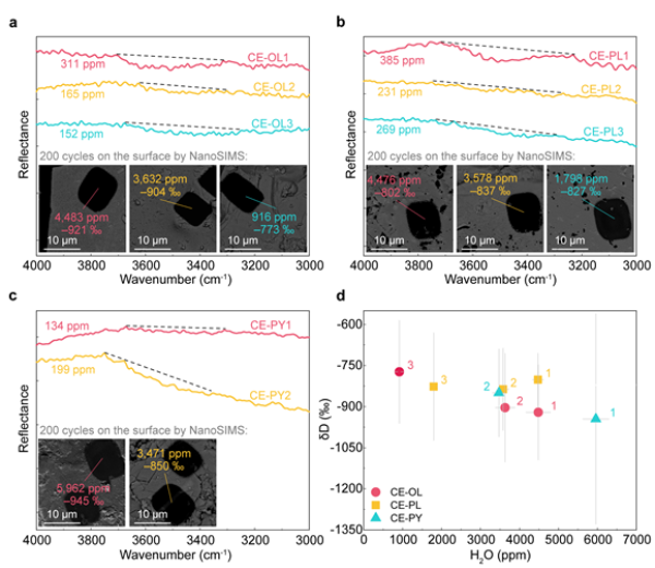 红外反射光谱(图1)分析发现,嫦娥五号矿物普遍在3,200 ~ 3,800 cm-1存在一个较宽的吸收峰,表明OH的存在。其中,在CE-PL2斜长石中发现3,300 cm-1存在一个小的吸收峰以及1,640 cm-1存在一个较宽的吸收峰,表明H2O的存在。基于地球样品红外反射光谱校正确定了嫦娥五号矿物中的整体水含量,其中,橄榄石(CE-OL1、CE-OL2、CE-OL3)的水含量为152 ± 14 ~311 ± 30 ppm、斜长石(CE-PL1、CE-PL2、CE-PL3)的水含量为231 ± 16 ~ 385 ± 27 ppm、辉石(CE-PY1、CE-PY2)的水含量为134 ± 19 ~ 199 ± 28 ppm。纳米离子探针(NanoSIMS)分析了矿物最表层约200nm范围内的水含量和氢同位素比值,橄榄石表层水含量为916 ± 38 ~ 4483 ± 314 ppm、斜长石表层水含量为1798 ± 81 ~ 4476 ± 142 ppm、辉石表层水含量为3471 ± 166 ~ 5962 ± 335 ppm。氢同位素分析显示这些水显著富H贫D的特征(δD = –773 ± 188 ~ –945 ± 384 ‰),接近太阳风的氢同位素比值(δD ≈ –1,000 ‰)。红外反射光谱和NanoSIMS分析得到的水含量差异主要归因于测试深度的差异,指示了矿物中的水主要分布在极表层内。矿物中水富集在表层内和高度贫D的特征,指示了水的太阳风来源,且水主要以OH的形式存在,少部分或以H2O的形式存在。
