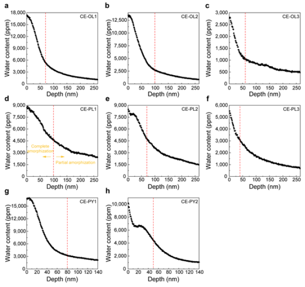透射电镜(TEM)图像显示,橄榄石、斜长石和辉石极表层均为部分非晶化和/或完全非晶化的环带(图2),能谱分析表明这些非晶质环带成分与下层晶体一致,证明了非晶质环带的形成是太阳风注入导致的。非晶质环带厚度主要在40~100 nm范围内,而水含量最高的斜长石(CE-PL1)与其他样品显著不同,其表层存在一个厚度约100 nm的完全非晶化环带,下部为厚度约400nm的部分非晶化环带。结合TEM和NanoSIMS分析绘制了嫦娥五号矿物中太阳风成因水的深度剖面图,如图3所示,矿物中最表层水含量最高,非晶质环带内随深度增加水含量急速减少,向下层晶体内缓慢减少。太阳风成因水的纵向分布特征表明,太阳风成因水主要分布在非晶质环带中,少量可以扩散进入内部晶体中。