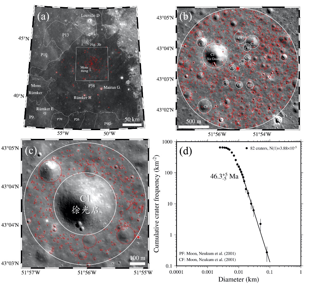 图2 (a) P58单元内主要源撞击坑(红点)分布;(b) 1km范围内撞击坑分布;(c)徐光启撞击坑光学影像;(d) 徐光启撞击坑统计定年结果