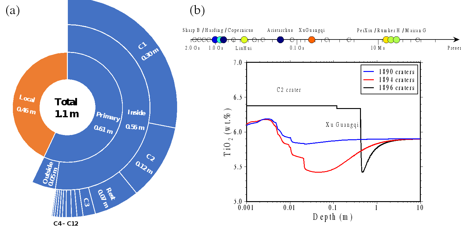 图3 溅射沉积物组成与混合:(a) 源撞击坑溅射物贡献比例分布;(b) 溅射物沉积序列模型所预测的钛丰度剖面