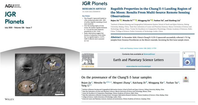 Bojun Jia, Wenzhe Fa, Minggang Xie, Yushan Tai, & Xiaofeng Liu. (2021). Regolith properties in the Chang’E-5 landing region of the Moon: Results from multi-source remote sensing observations. Journal of Geophysical Research: Planets, 126(7), e2021JE006934, doi:10.1029/2021JE006934.