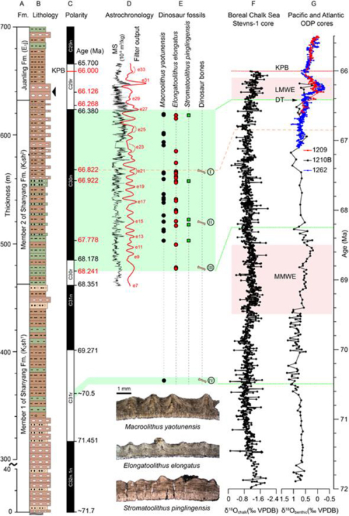 图2.图中表示的是山阳盆地的岩性柱(A和B)、磁极性序列(C)、天文调谐结果(D)、恐龙化石分布(E)以及海洋氧同位素记录在白垩纪末期的变化(F和G),指示盆地内的恐龙在其灭绝前的200万年间多样性很低,且古气候、尤其是温度的变化对恐龙的多样性有着重要的影响(作者 供图)。