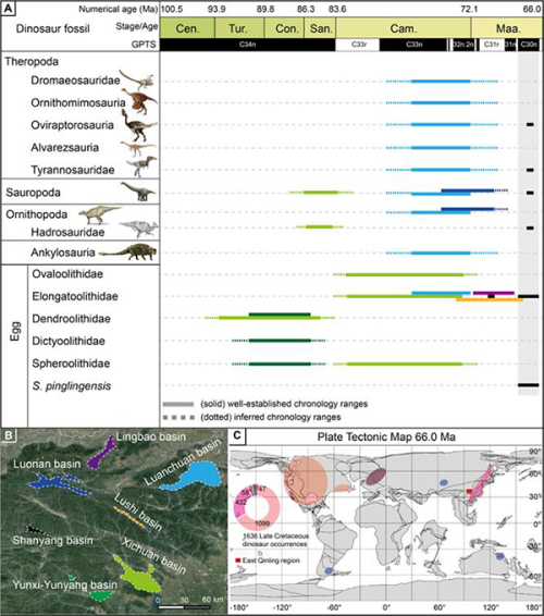 年代学结果显示,山阳盆地恐龙化石分布的时限是6824万年到6638万年前,表明山阳盆地内的恐龙多样性在其灭绝前的约200万年间一直处于比较低的水平。综合秦岭东部其他晚白垩世盆地,以及山东莱阳、广东南雄等地发现的恐龙化石,研究发现在7200万年前后中国的恐龙多样性有一个明显的降低趋势,这与北美西部的恐龙化石分布特征有相似之处,因此该研究认为恐龙多样性在晚白垩世的降低很可能是全球性现象(图3)。