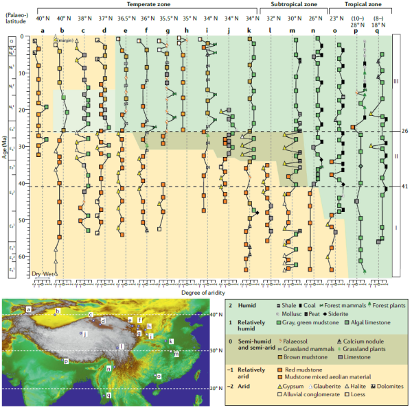 图2 代表性盆地/剖面岩性记录半定量反演的亚洲气候时空演化 (a,Ulugqat剖面;b,塔里木盆地;c,柴达木盆地西部;d,柴达木盆地边缘;e,西宁盆地;f,兰州盆地;g,临夏盆地;h,黄土高原;i,渭河盆地;j,羌塘;k,南阳盆地;l,囊谦盆地;m,江汉盆地;n,云南;o,百色盆地;p,尼泊尔;q,Irrawaddy盆地)