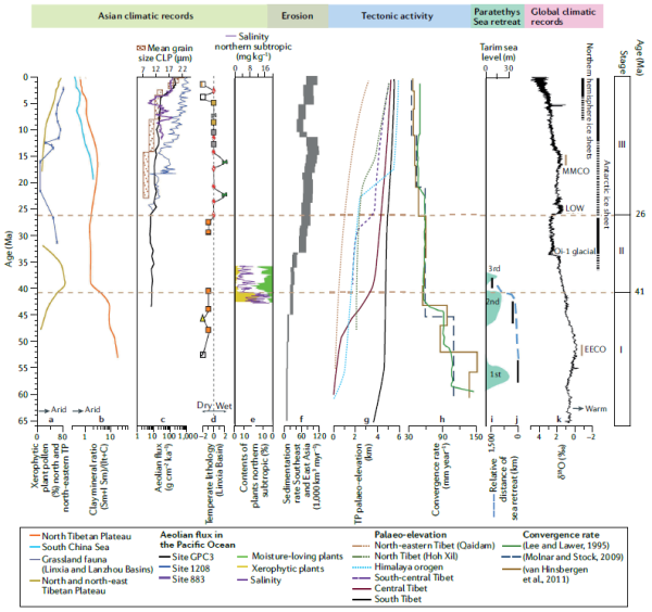 图3 亚洲气候记录、高原隆升记录及与全球气候变化等的对比
