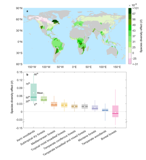 中国科学院青藏高原研究所生态系统功能与全球变化团队研究员汪涛等利用全球70多万个森林样方的树种多样性监测数据,结合森林生长应对干旱抵抗力的遥感观测分析结果,剖析了树种多样性对森林抵抗力的影响机制,绘制了全球首幅树种多样性对森林抵抗力影响的空间分布图。