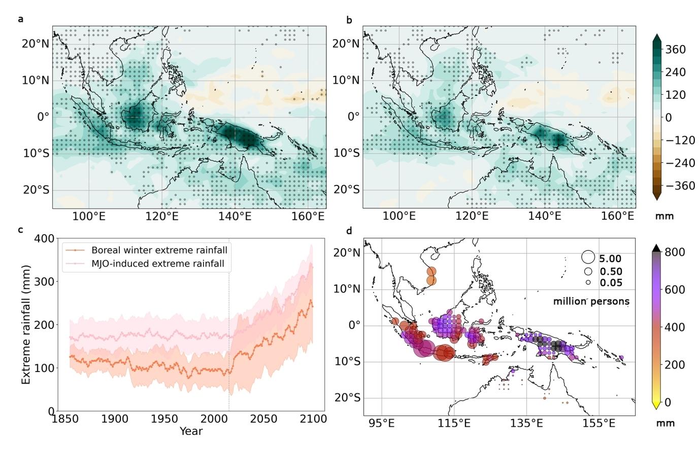 在极端的变暖情景(SSP5-8.5)下,区域内预计的总极端降雨增加达到103.9 mm,是历史时期的60%。而约84%的极端降雨的增加与活跃的MJO相关,说明MJO在未来预测极端降雨中起到重要作用。从空间上看,大部分极端降雨(图1a),包括MJO引起的极端降雨(图1b),都集中在陆地上,尤其是马来西亚、印度尼西亚、巴布亚新几内亚和新加坡等地区。从时间上看,极端降雨和MJO引起的极端降雨都呈现出显著快速增加的趋势(图1c)。在区域内平均而言,极端降雨增加的趋势是每十年增加18.5 mm,而MJO引起的极端降雨是每十年增加15.6 mm。由MJO引起的极端降雨往往也带来社会影响。就海洋性大陆来看,以极端降雨超出五年重现值为阈值,约9385万人口和940万平方公里的城市区域将会暴露在快速增加的极端降雨中。