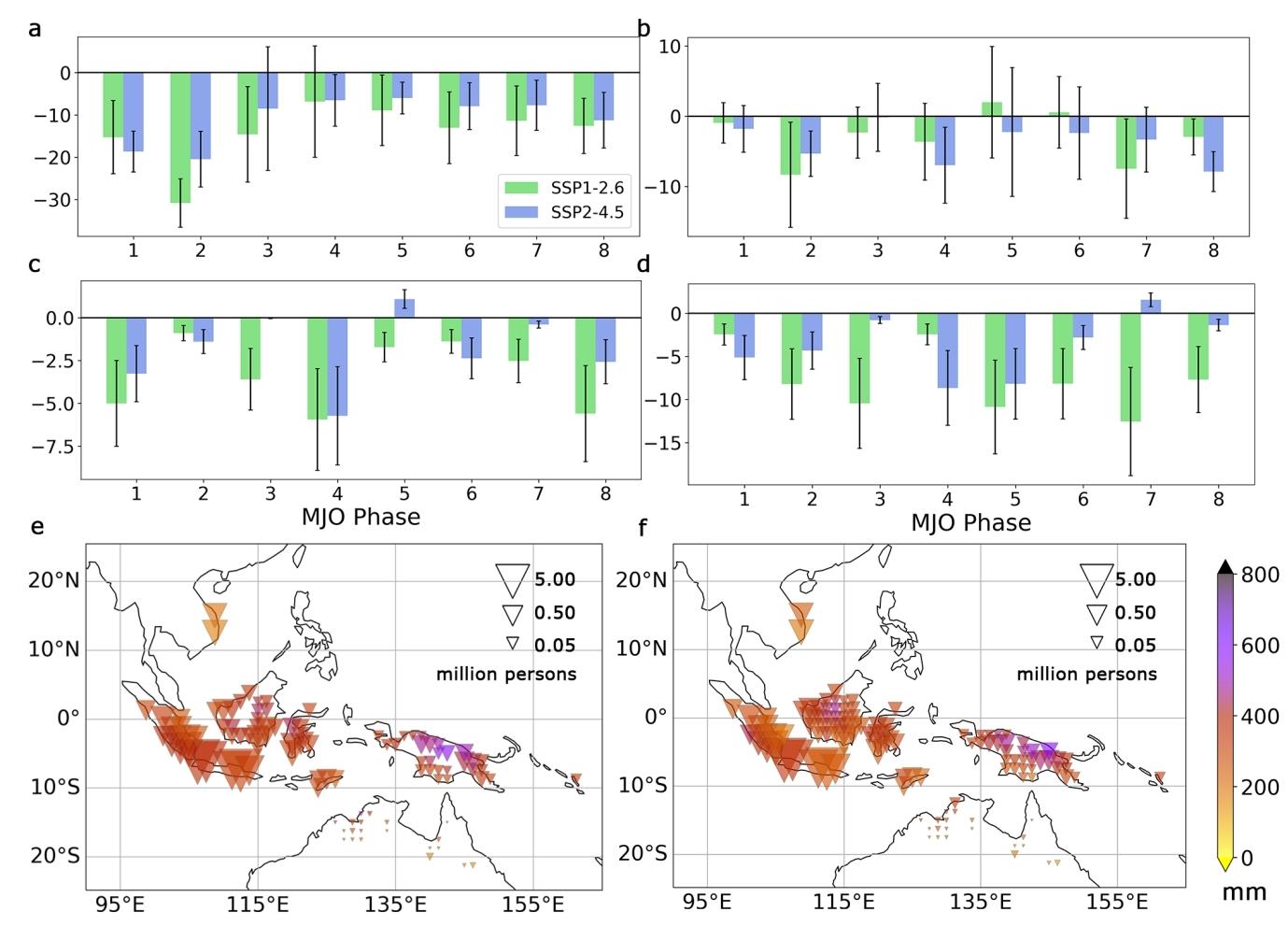 在缓解气候变化的情景下,预计MJO引起的极端降雨也将被限制更低的水平。但是在不同的MJO相位,极端降雨减少量不同。比如在海洋性大陆,虽然极端降雨在每个MJO相位都显著减少,但在第2个相位减少量更多(图2a)。类似地,在菲律宾(图2b)和中南半岛(图2c),在MJO的第4个相位极端降雨减少量较多,而在澳大利亚北部(图2d),在第5至第8相位的极端降雨都明显减少。随着MJO引起的极端降雨的减少,在SSP2-4.5情景下(图2e),预计暴露在超出5年重现值的极端降雨的人口和城市地区也将大幅减少,仅为485万人及12万平方公里的城市面积,相较于SSP5-8.5情景,分别减少了95%和99%。