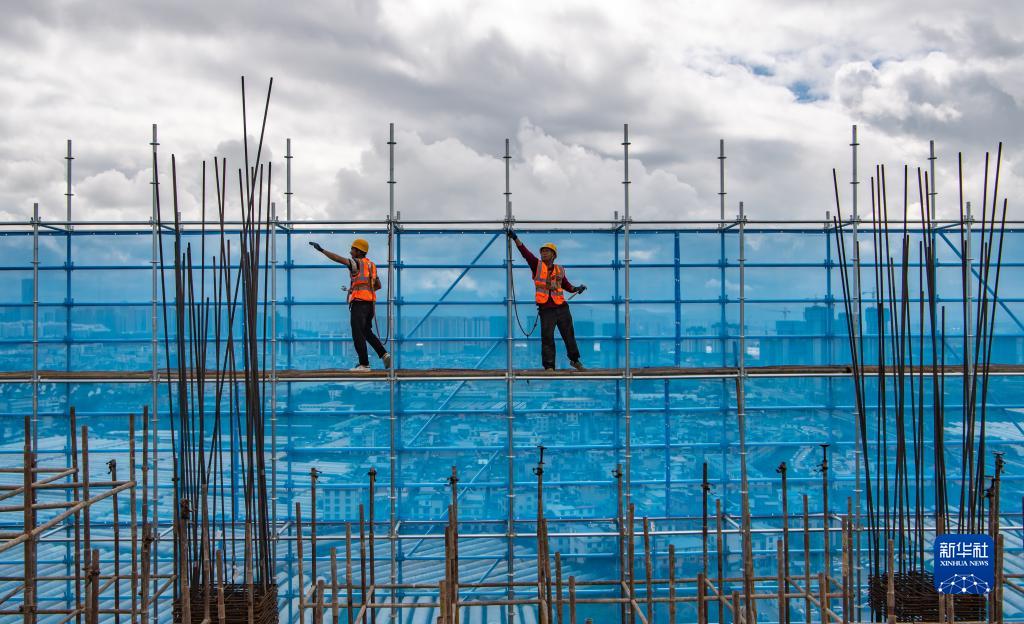 10月2日,中建七局西南公司工人李忠文(右)与王应华在昆明斗南花卉小镇花卉产业综合配套服务区项目建设工地施工。新华社记者 江文耀 摄