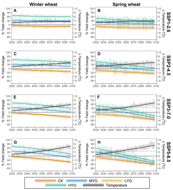 图2.未来不同品种小麦产量相对于基准气候下对照品种的变化趋势。CK:对照品种,LYG:低产品种,MYG:中产品种,HYG:高产品种。虚线是当MYG产量下降到基准气候对照品种产量时的温度阈值。