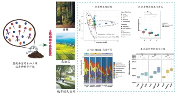 中国科学院院士、中科院城市环境研究所研究员朱永官团队为探究土壤病毒群落对快速城市化过程中土地利用类型变化的响应,在福建省厦门市采集森林、农田、菜地、公园及绿化带五种不同利用方式的土壤样品,采用病毒组学和宏基因组学技术解析其病毒及细菌群落,获得近60,000个新的土壤病毒种群,扩充了对土壤病毒多样性的认知,揭示了病毒在不同土地利用类型中的分布规律,并发现了土地利用方式对土壤病毒群落结构的影响大于空间异质性以及pH是驱动土壤病毒群落结构变化的重要环境因子。研究表明:土地利用方式变化影响土壤病毒群落的生活方式并改变病毒-细菌宿主互作模式;土地利用方式的变化导致土壤病毒生态位的分化,进而驱动土壤病毒群落的演化。