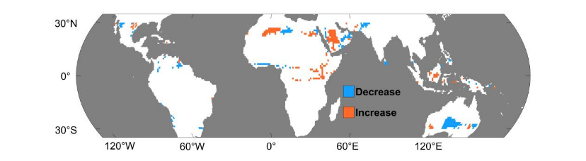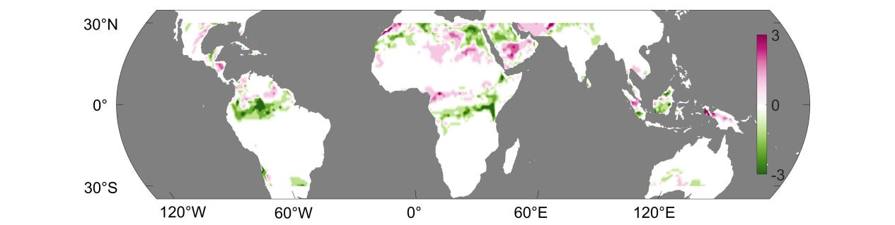 图(上)与1935-1954年相比,1995-2014年期间热带地区雨、旱季频次变化空间分布;