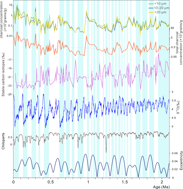 该项研究结果表明华北平原地区第四纪以来火活动存在显著波动,受到太阳辐射、植被环境、生物量、人类活动等多种因素的综合作用。2.1–0.3 Ma时期炭屑浓度相对较低,指示了这一时期火活动相对较弱,自然野火发生的频率不高。其中,中更新世气候转型时期炭屑浓度波动较大,表明在气候转型期间自然野火极为不稳定。距今30万年以来,炭屑浓度显著增加,显示华北地区火活动较为活跃,自然野火频发。同时,炭屑浓度与深海氧同位素、黄土-古土壤粒度呈现出对应关系,冰期时炭屑浓度相对偏高,表明气候干冷时期野火发生的频率更高。炭屑浓度峰值则多出现于冰期-间冰期间隙,指示气候转型时期多出现区域性大火。