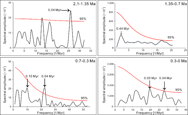 功率谱分析结果显示,炭屑浓度存在明显的40 kyr周期,指示太阳辐射量控制下的气候变化是东亚地区火活动的重要影响因素之一。值得注意的是,中更新世以来人类控制性用火的大量出现,对全球火活动产生了显著的影响。G3钻孔炭屑浓度在距今2.1–0.3 Ma时期相对较低,与中国北方地区考古遗址数量并无明显的联系,表明这一时期的火为天然野火。距今30万年以来,干冷的气候条件可能促使了火的频繁发生,为古人类学习如何控制性使用和管理火提供了更多机会。另一方面,人类对火的广泛使用,可能也促使了火活动的频率增加,如0.3 Ma与0.05 Ma时期炭屑浓度的迅速上升均对应着考古遗址数量的快速增加,表明人类在火的演化过程中开始发挥着重要作用。