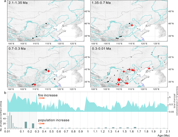 图3 中国北方地区2.1Ma以来火活动与考古遗址、火塘遗迹对比