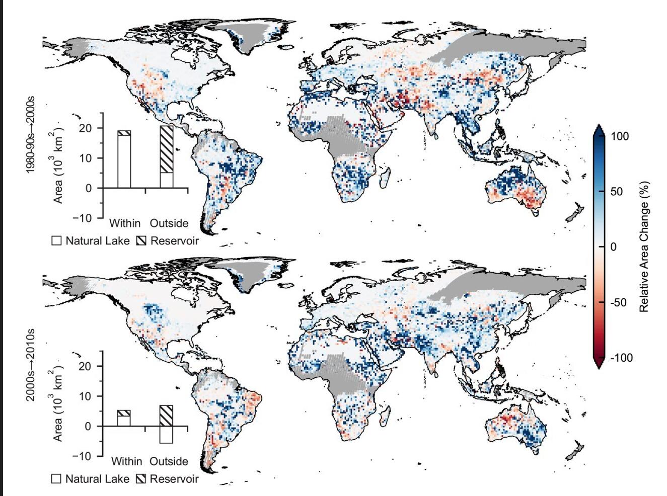 研究首次追溯了近40年3个时间段(1984-1999,2000-2009, 2010-2019)的全球湖泊面积变化过程,并探究了气候变化以及人类活动的影响。从第一时段(1984-1999)到第三时段(2010-2019),全球除南极洲以外的六大洲湖泊面积均呈现净增加趋势,总增加面积为46278km2;其中第二到第三时段(2010-2019)增加的面积仅有第一到第二时段的16.3%。从全球尺度上看,研究明确了由人类控制的水库调蓄(56%)而非由气候变化导致的冰川冻土融化是造成全球湖泊面积扩张的主要因素。