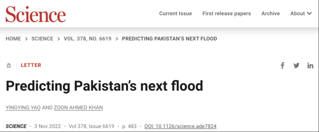 西安交通大学人居学院姚莹莹教授联合清华大学Zoon Ahmed Khan研究员,撰写题为“预测下一次巴基斯坦洪水”(Predicting Pakistan’s next flood)的评述文章,发表于11月4日出版的最新一期《科学》(Science)期刊上。
