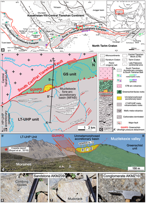 中国科学院院士、中科院新疆生态与地理研究所新疆矿产资源研究中心研究员肖文交团队,选取了位于南天山造山带阿克牙孜低温-超高压变质杂岩带中的一处弧前增生盆地(图1),开展碎屑锆石年代学及沉积大地构造演化研究,并结合区域上三大岩类的地球化学和年代学大数据汇总,系统梳理古亚洲洋西南缘的南天山洋闭合过程中沉积碎屑物源、壳-幔响应以及区域地球动力学格架之间的时空演化关系。