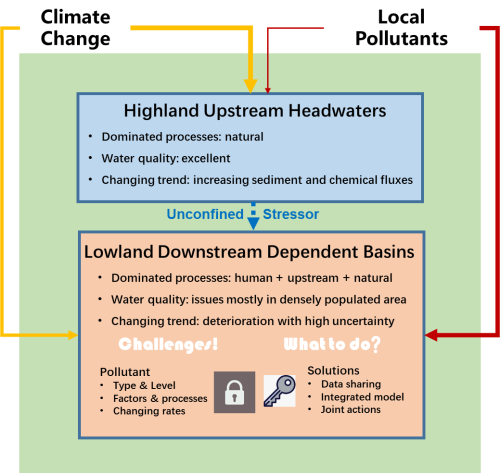 因此,上游水质的变化将对下游地区产生进一步的压力,下游的水质安全已面临着当地人类活动和气候变化的挑战(如图)。例如,水温上升,加剧水体富营养化;降雨和春季融水增加,导致洪灾加剧;洪水与废水的混合污染物的重新分布、极端天气事件引起干旱增加,导致河水稀释能力和地下水水位降低,进一步增加地下水污染的风险。