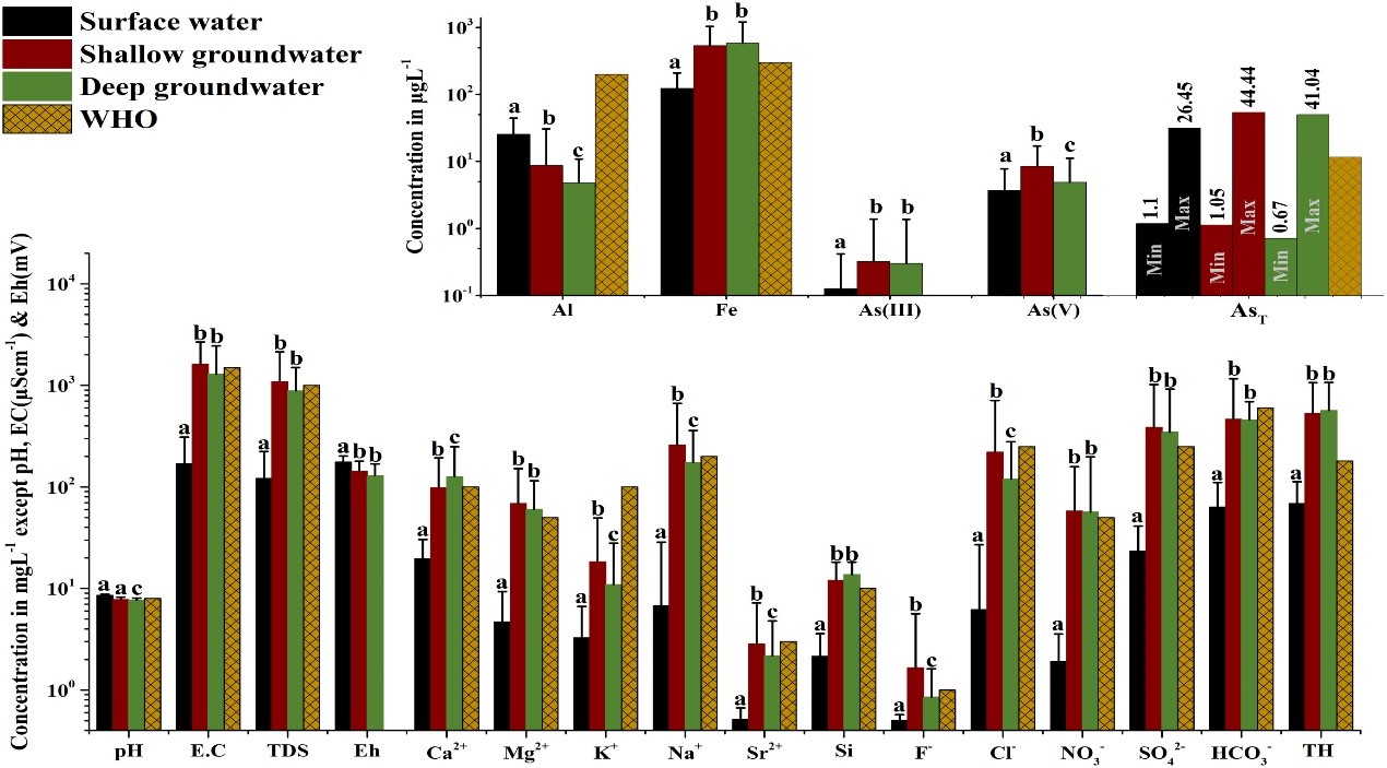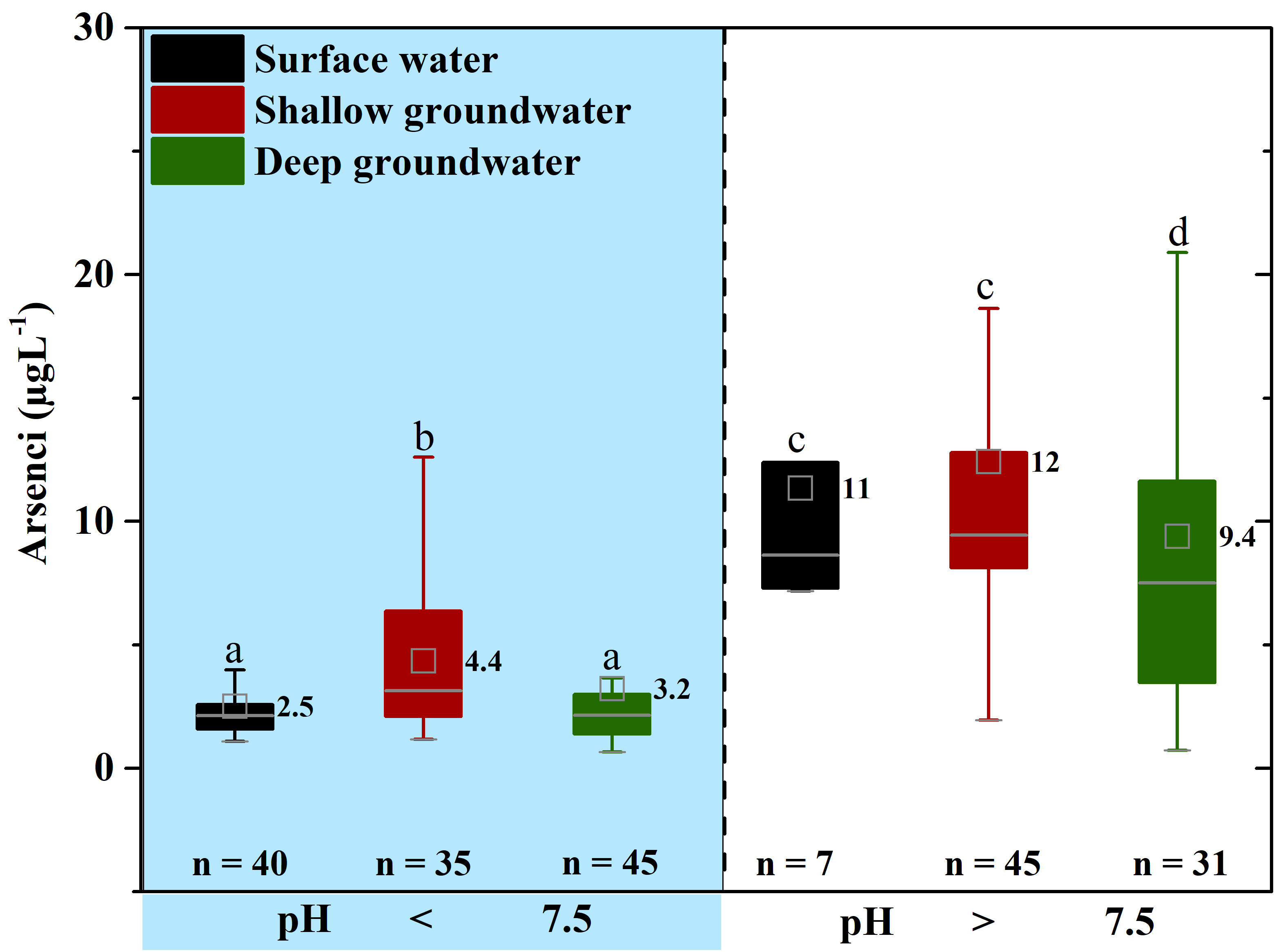 水化学特征方面(图1),巴基斯坦印度河中上游地区水体呈中性至强碱性和氧化状态。部分区域的水体特别是地下水,总溶解固体浓度(TDS)和总硬度(TH)超过了世界卫生组织(WHO)饮用水标准。对于砷元素,31%的浅层地下水(SGW)砷浓度超标,其次是深层地下水DSW,14%)和地表水(SW,4%)。