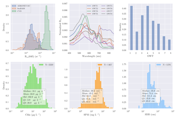 近海岸与内陆湖泊与人类密切相关,其环境正经历史无前例的改变。监测其水环境时空格局,将有助于理解水体的变化趋势,优化水环境管理方式。如今,传统野外调查和实验室测量的方式在观测区域或全球水体变化方面存在时空尺度有限等问题,而卫星遥感则凭借着大尺度覆盖、高频率重访、免费等优势,优势愈发凸显。目前,水色遥感已成为水体监测的重要手段之一。然而,传统水体大气校正方法在浑水时常失效,遥感反射率的缺失与较高的不确定性造成传统水色遥感定量反演算法难以应用,一定程度上限制了大尺度水色遥感的进程。