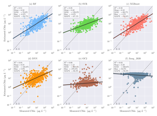 (3)R_land与机器学习相结合成功估算了全球水体悬浮物浓度,但无法用于准确获取全球水体叶绿素a浓度。随机森林、支持向量机和XGBoost等方法均比传统经验和半分析算法具备更好的精度,在全球水体悬浮物浓度的估算误差小于25%,可用于估算全球近岸和内陆湖泊的悬浮物浓度分布(图4)。但是,R_land无法获取准确的叶绿素a浓度,机器学习模型误差亦超过50%(图5)。