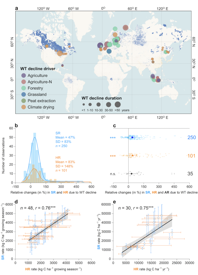 图1 Relative changes in soil respiration (SR) and its components, heterotrophic respiration (HR) and autotrophic respiration (AR), due to water table (WT) decline in global pristine peatlands. a Distribution of the in situ observations. b Frequency distributions of the relative changes in SR and HR due to WT decline (AR was not shown due to the scarcity of data points (n = 35)). c Relative changes in SR, HR and AR due to WT decline. d Pearson correlation of the growing season HR and SR rates in pristine and drained boreal peatlands. e Pearson correlation of the annual HR and SR rates in pristine and drained tropical peatlands. No data were observed in pristine and drained temperate peatlands. Each data point for WT decline impacts on in situ SR and its components was classified on the basis of the driver of WT decline and duration of WT decline in (a). The grey–blue regions in (a) indicate the global distributions of peatlands derived from PEATMAT5. The larger solid circles and horizontal bars in (c) denote the weighted means of relative changes and their 95% confidence intervals. The smaller circles and numbers in (c) indicate individual relative changes due to WT decline and the number of data points, respectively. The open circles and bars in (d, e) show the means and standard deviations for individual data points. The asterisks *, **, *** indicate significance at the levels of p < 0.05, 0.01 and 0.001, respectively, and n.s. indicates no significance (for details, see Meta-analysis in Methods).