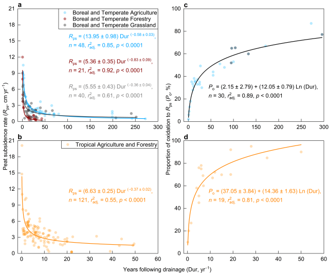 图2 Drainage duration controls peat subsidence rate (Rps) and the proportion of peat oxidation to Rps (Po). a, b Relationships of Rps with drainage duration (i.e., years since drainage) for drained peatlands across different climate zones and land uses. c, d Proportion of subsidence attributed to peat oxidation (Po) with drainage duration for drained peatlands across different climate zones and land uses. The fitted regression curves and their 95% confidence intervals are shown. The same Po was used for drained boreal and temperate peatlands under different land uses due to a lack of sufficient observations. Similarly, the same Po was used for drained tropical peatlands under different land uses.
