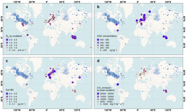 图3 Peat subsidence rate (Rps) (cm yr–1) due to oxidation and associated soil heterotrophic CO2 emissions. Spatial variations in the (a) estimated Rps due to oxidation of drained peatlands, (b) soil organic carbon (SOC) concentration (g kg–1) of pristine peatlands, (c) soil bulk density (BD, g cm–3) of pristine peatlands, and (d) estimated soil heterotrophic CO2 emissions due to peat oxidation (kg C ha–1 yr–1) among global drained peatlands. For the calculation processes of Rps and HR, see the Methods. The grey‒blue regions indicate the global distributions of peatlands derived from PEATMAT5.