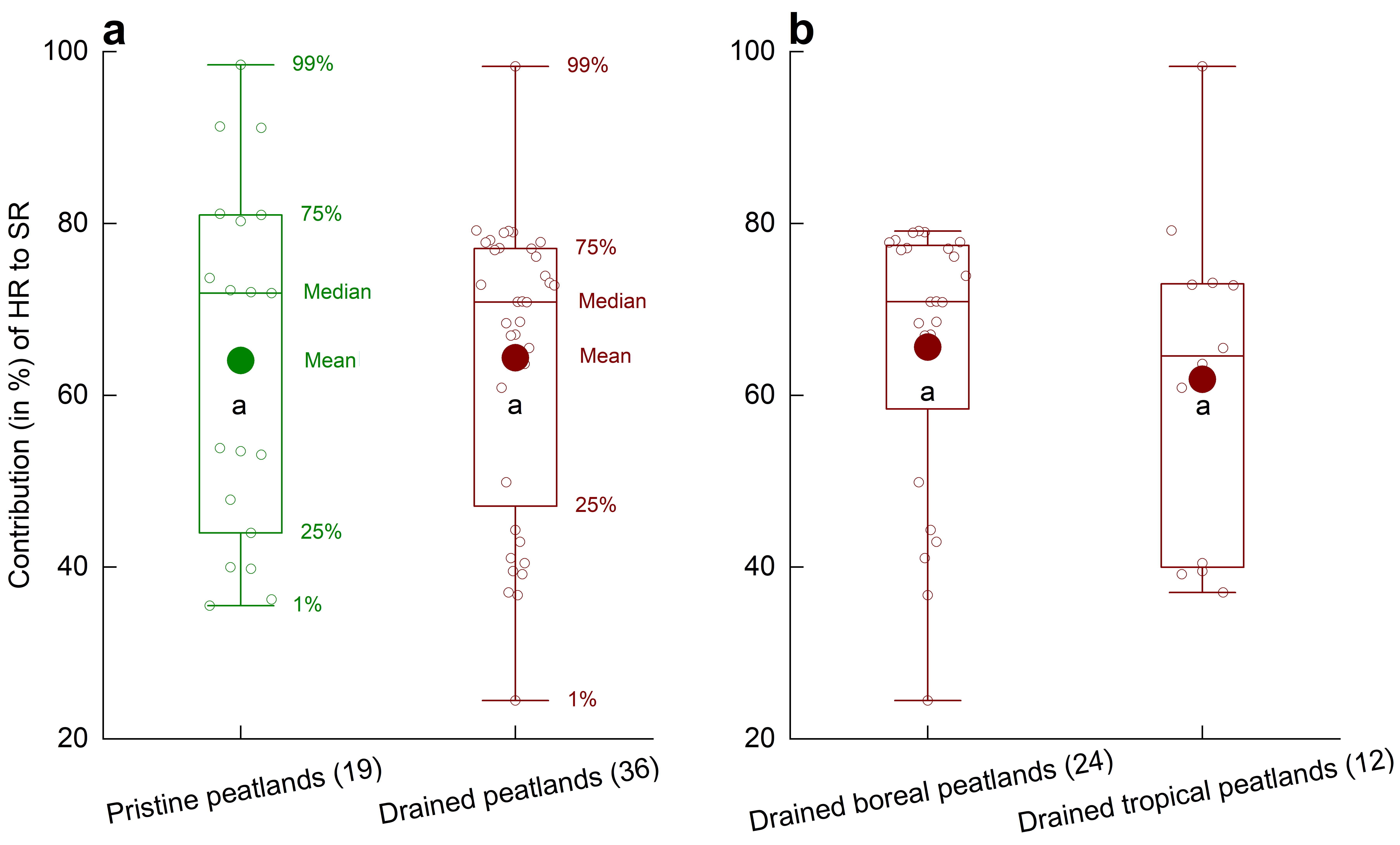 图4 Contributions of soil heterotrophic respiration (HR) to soil respiration (SR). a Contributions for pristine and drained peatlands. b Contributions for drained boreal and tropical peatlands. The same lowercase letter within the plot indicates no significances of median or mean between pristine and drained peatlands or drained boreal and tropical peatlands at the level of p < 0.05 using Mann-Whitney U-Test. The notes in (a) are also applied to (b).