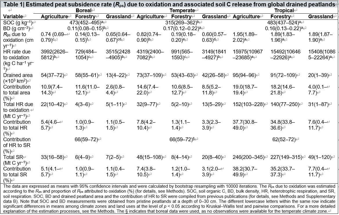 针对以上关键科学问题,兰州大学大气科学学院地气相互作用与全球变化团队马磊青年研究员和左洪超教授使用荟萃分析(Meta-analysis)和自举重采样(Bootstrap-resampling)以及全球尺度扩展(Global upscaling)等方法,首次明确了人为排水导致的水位下降主要通过促进土壤异养呼吸而非自养呼吸而促进土壤呼吸(图1),从而引起泥炭地地表的大规模塌陷,且这种级联效应广泛存在于全球不同气候带不同土地利用类型之中(人为排水后的不同土地利用方式如农田、草地)(图2)。在此基础上,研究团队构建了基于地表塌陷速率计算全球不同气候带、泥炭地不同土地利用类型的年土壤异养呼吸排放量的公式,精细估算了由人为排水活动引起的土壤异养呼吸年排放量空间分布特征和全球总排放量(图3和表1),结合土壤异养呼吸占土壤呼吸的比例(图4),估算了人为排水活动引起的全球泥炭地土壤呼吸年排放总量为23.6(14.7–37.6)亿吨 CO2(表1)。结果表明,受人为排水活动影响的全球泥炭地以仅占全球陆表的~0.3%的面积,却贡献了全球土地利用变化年CO2总排放量(168.7亿吨CO2)的~14%(8.7–22%),贡献了全球化石燃料和土地利用变化年CO2总排放量(513.3亿吨CO2)的~4.6%(3.0–7.3%)。这些研究结果突显了保护自然泥炭地和恢复退化泥炭地对减缓气候变化的重要作用。