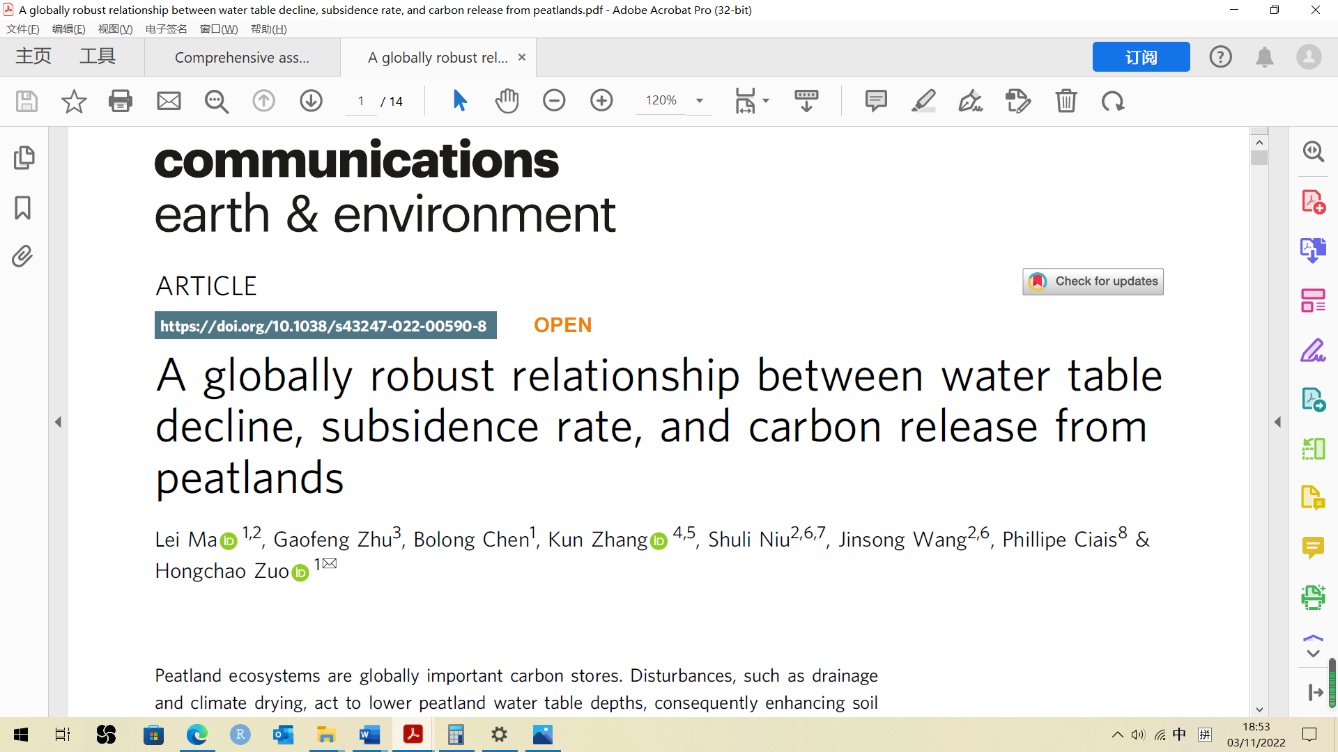 (1)Lei Ma, Gaofeng Zhu, Bolong Chen, Kun Zhang, Shuli Niu, Jinsong Wang, Phillipe Ciais, Hongchao Zuo*. 2022. A globally robust relationship between water table decline, subsidence rate, and carbon release from peatlands. Communications Earth & Environment. 3, 254. https://doi.org/10.1038/s43247-022-00590-8