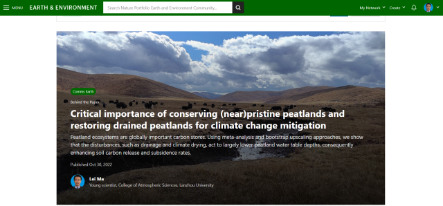 以上研究成果以“A globally robust relationship between water table decline, subsidence rate and carbon release from peatlands”为题于10月29日发表在Nature新刊Communications Earth & Environment(图5),并被编辑部遴选为封面论文。文章在线发表后,受Nature Portfolio Communities高级经理Dr. Eve Satkevic的邀请,研究团队在Nature Portfolio Earth and Environment Community以“Critical importance of conserving (near)pristine peatlands and restoring drained peatlands for climate change mitigation”为标题分享了研究工作背后的故事,并强调了保护全球自然泥炭地和恢复退化泥炭地对减缓气候变化极为重要(图6)。