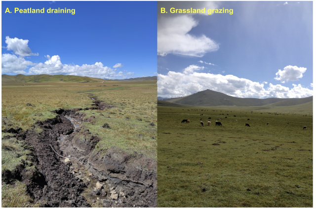 图7 Landscapes of peatland draining (A) and grassland grazing (B) on the Tibetan Plateau (photo by Lei Ma).
