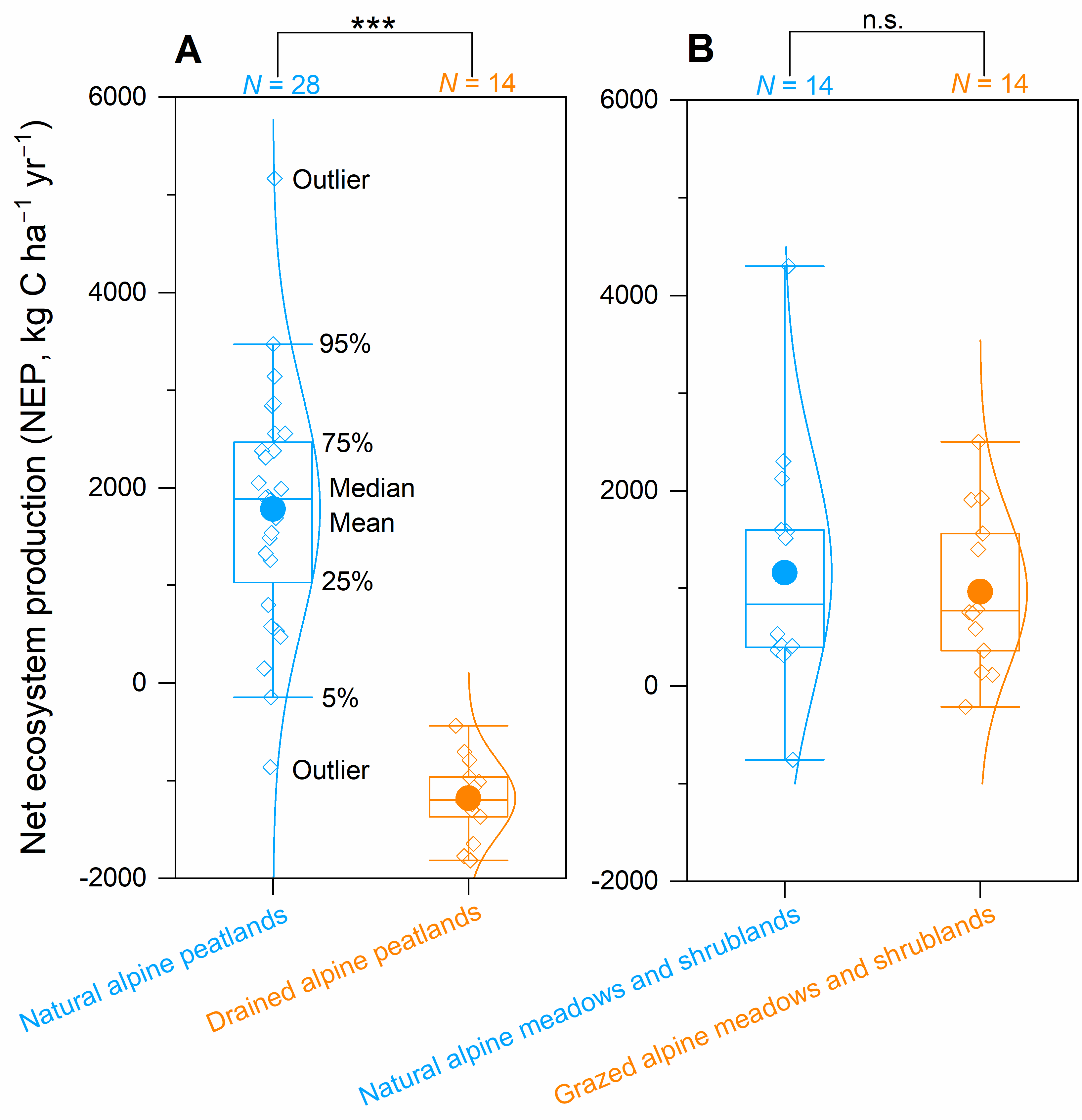 图8 Net ecosystem production of alpine ecosystems under different disturbances. The *** and n.s. indicate P< 0.001 and no significance, respectively. The datasets are directly extracted from Wei et al. (2).