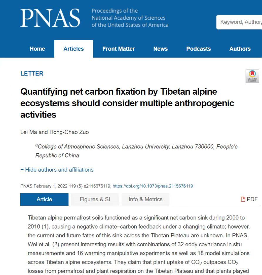 (2)Lei Ma* & Hongchao Zuo. 2022. Quantifying net carbon fixation by Tibetan alpine ecosystems should consider multiple anthropogenic activities. Proceedings of the National Academy of Sciences of the United States of America, 119, 1–2.https://doi.org/10.1073/pnas.2115676119