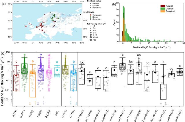 图10 (a) Distribution of synthesized annual flux datapoints across European peatlands. (b) Frequency distributions of annual nitrous oxide (N2O, kg N2O-N ha-1 yr-1) fluxes for natural, drained and rewetted peatlands. (c) Boxplot for multiple comparisons of annual mean N2O fluxes from European peatlands under different peatland statuses (N = natural wetland, D = drained wetland, and R = rewetted wetland), climatic regimes (T = temperate, B = boreal, and S = subarctic) and nutrient supply types (M = minerotrophic and O = ombrotrophic), as well as three simultaneously considered factors; the numbers in parentheses indicate the datapoints within each subgroup. The boxplot shows the median (central thick lines), mean (rhomboidal points), 25% and 75% quartiles, and 1% and 99% ranges (i.e., the upper and lower whiskers) around the median. Datapoints above (below) the upper (lower) whisker indicate outliers. The same lowercase letter indicates a lack of mutually significant differences at the 95% confidence level. The distribution of European peatlands was derived from PEATMAP (http://peatdatahub.net/).