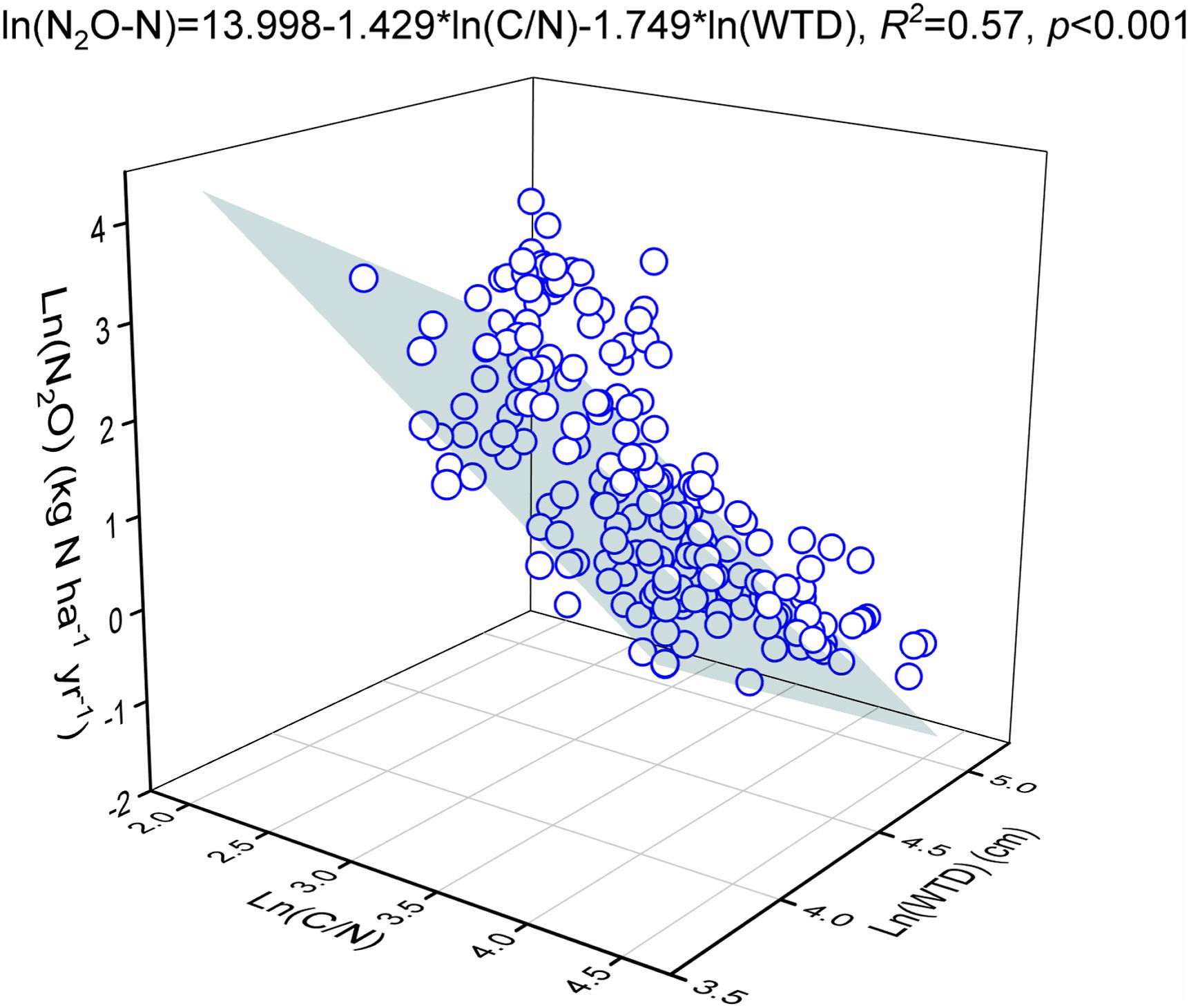 图11 Binary relationship between annual mean N2Ofluxes and annual mean water table depth (WTD) and soil (0–30 cm) carbon to nitrogen ratio (C/N) across different peatlands in Europe. The annual N2O fluxes, WTD and soil C/N ratios were log-transformed. For the data analysis method, see the statistical analysis section in the body text.