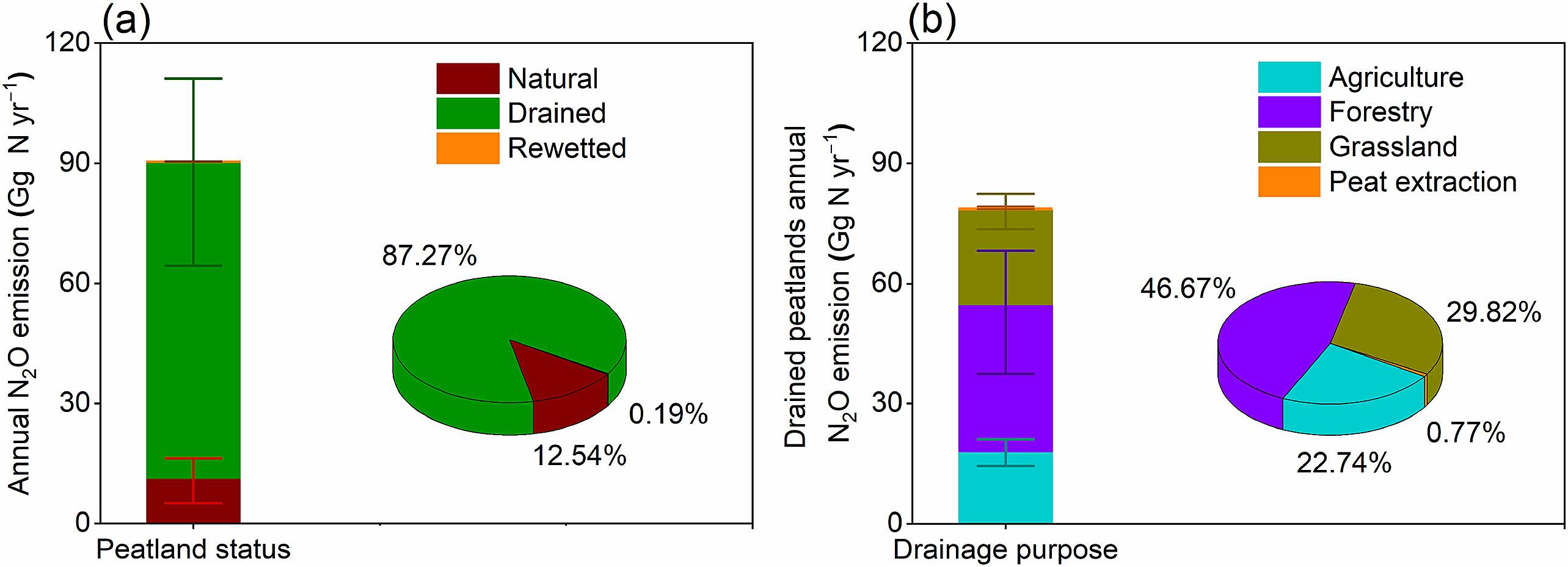 图12  Total annual N2O emissions from European peatlands (a) and drained peatlands (b) in 2020 (baseline emissions). The vertical error bars indicate the 95% confidence intervals which were obtained on the basis of a bootstrapping method. For the emission estimation method details, see the statistical analysis section in the body text.