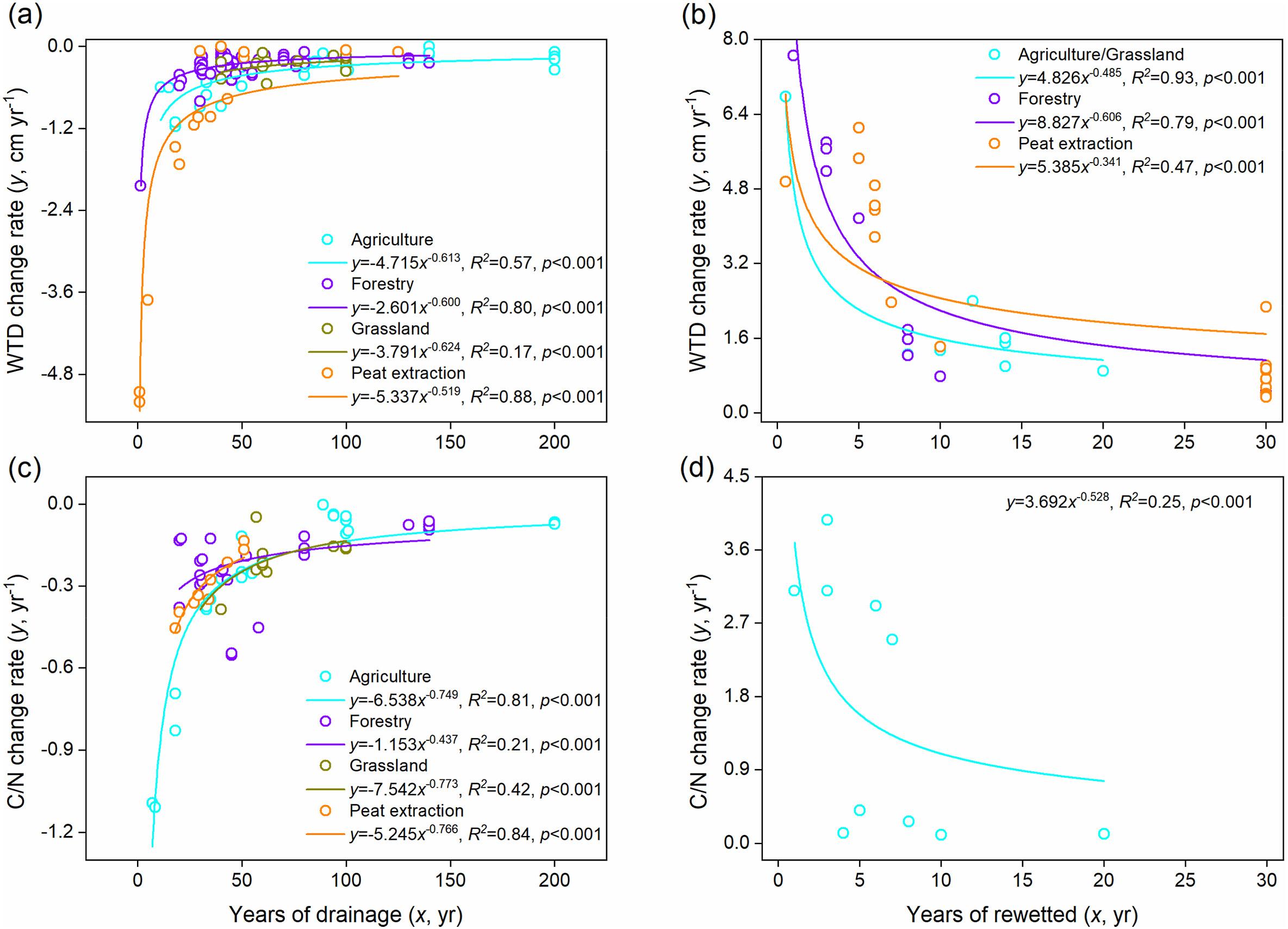 图13  Regression analysis of the annual change rate of peatland water table depth (WTD) or soil (0–30 cm) carbon to nitrogen ratios (C/N) versus years since drainage (a and c), and rewetting (b and d). For subfigure d, we were unable to fit regression curves for different land-use histories before rewetting due to the lack of enough observations.