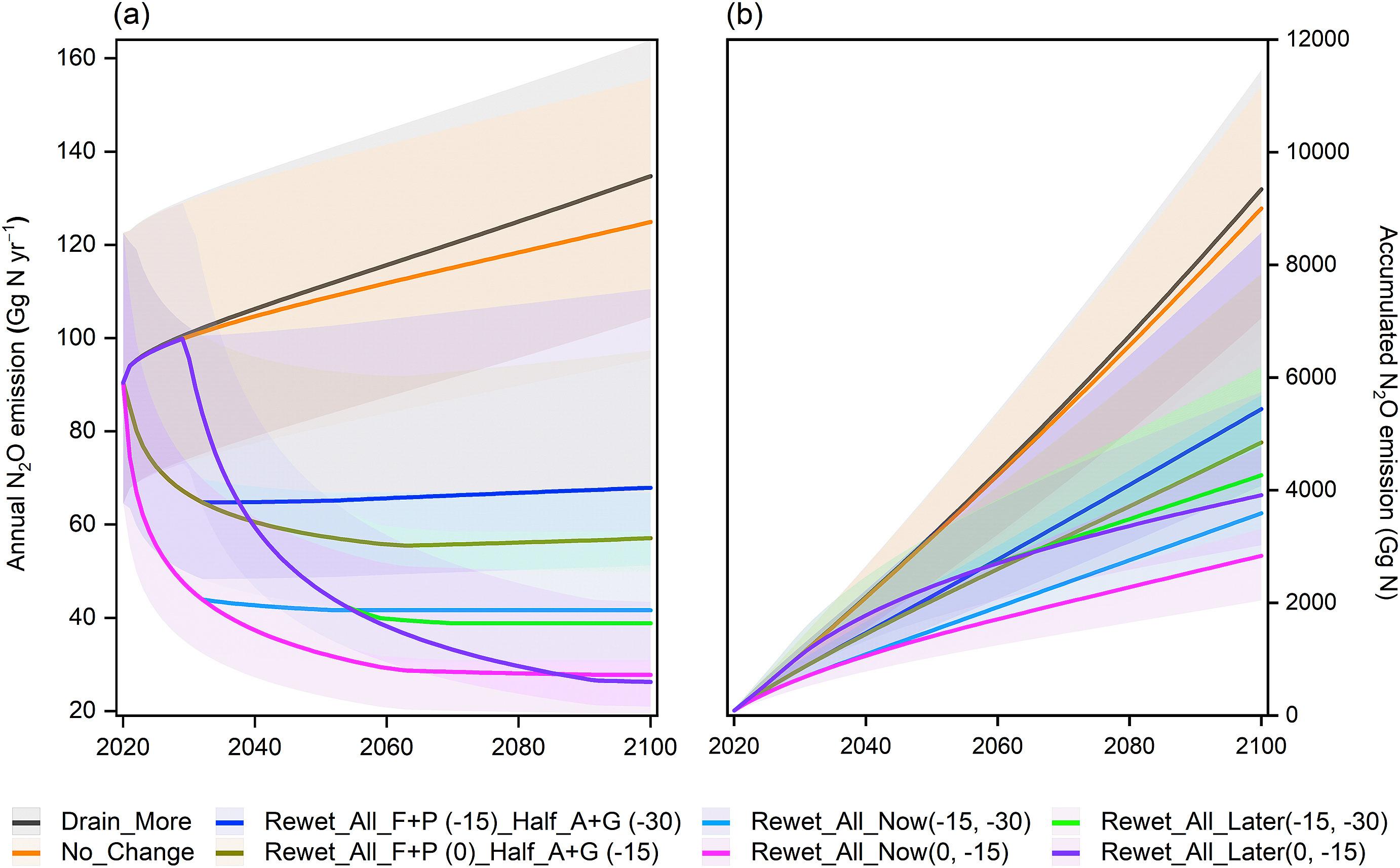 图 14 Estimated 2020–2100 annual mean (a) and cumulative (b) N2O emissions across European peatlands under different scenarios. The shaded areas of the annual and cumulative mean N2O emissions represent the 95% confidence intervals (CIs), which were obtained on the basis of a bootstrapping method. For details of the estimation method, see the statistical analysis section in the body text.