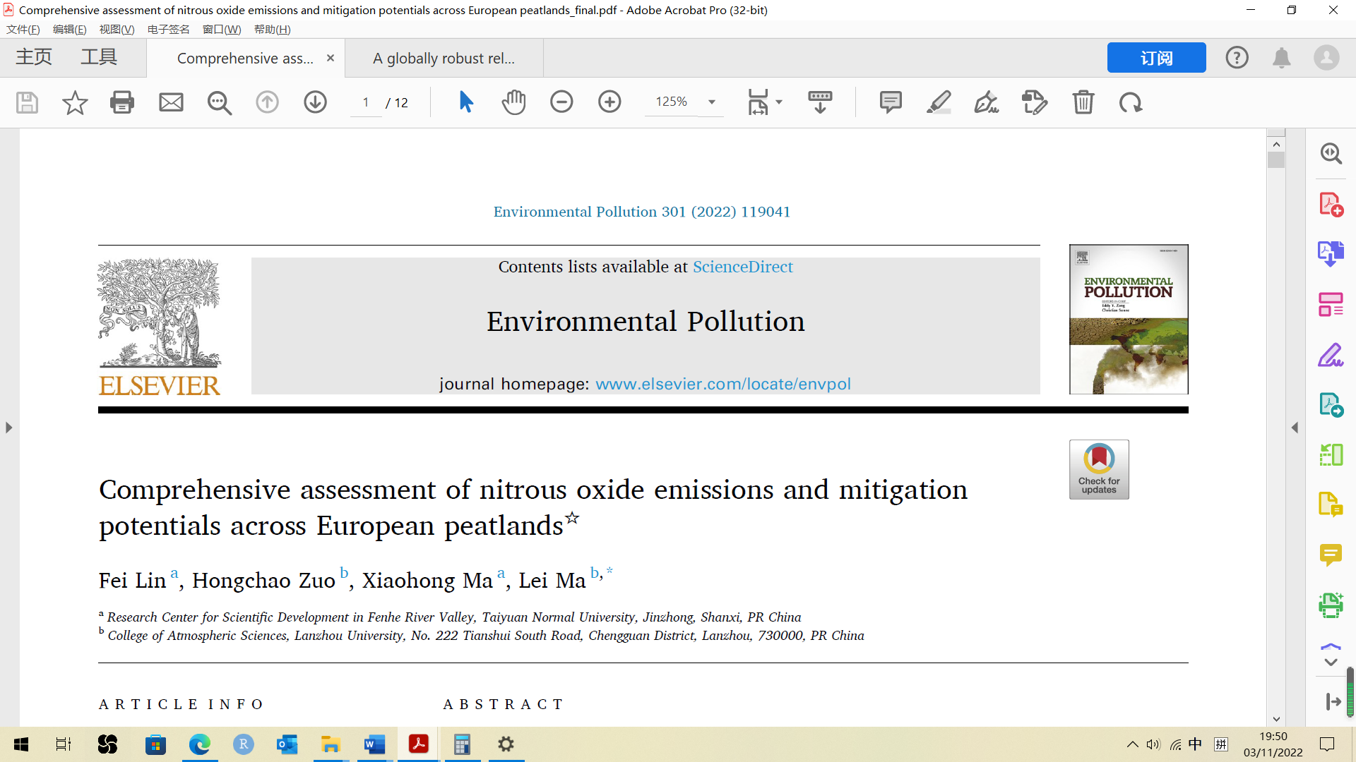 (3)Fei Lin, Hongchao Zuo, Xiaohong Ma, Lei Ma*. 2022. Comprehensive assessment of nitrous oxide emissions and mitigation potentials across European peatlands. Environmental Pollution, 301, 119041.https://doi.org/10.1016/j.envpol.2022.119041