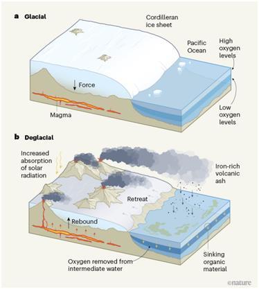 图1:科迪勒拉冰盖消融与区域性地壳均衡调整诱发的火山活动、生物地球化学过程、以及海洋缺氧之间的关系。