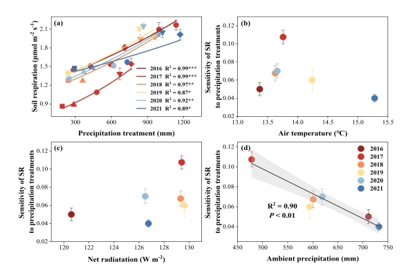 图1.2016-2021年不同降雨处理下的土壤呼吸和年降雨量之间的指数回归(a),以及土壤呼吸对降雨处理敏感性与气温(b)、净辐射(c)和降雨(c)的关系