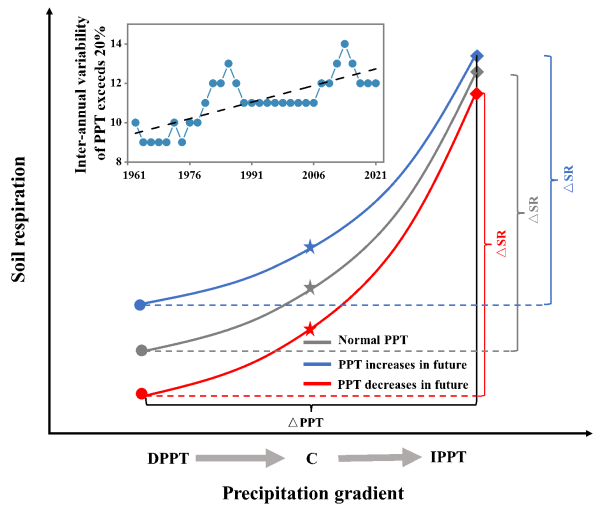 图2.预测未来土壤呼吸(△SR)随降雨(△PPT)梯度变化的概念模型