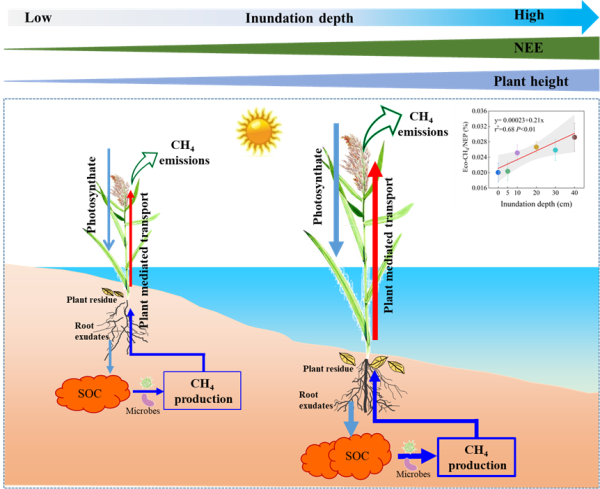 依托野外原位淹水深度控制试验平台(0、5、10、20、30和40cm淹水深度),通过滨海湿地土壤CH4排放、总生态系统CH4排放、净生态系统CO2交换和植物性状等长期定位监测,该工作揭示了淹水深度对植物介导的CH4排放的影响。研究发现,淹水深度减少了土壤CH4排放,但增加了总生态系统CH4排放(图3)。在不同淹水深度条件下,植物介导的CH4排放占总生态系统CH4排放的99%。另外,淹水深度(0至20cm)强烈刺激了植物介导的CH4排放。一方面,增加的净生态系统CO2交换促进了植物介导的CH4产生,这可能是由于来自光合输入的碳为产甲烷菌提供了能量和碳源;另一方面,植物高度与植物介导的CH4排放显著相关,这表明植物性状在CH4传输过程中起着重要作用(Zhao et al. 2023, Functional Ecology )。该研究强调了水文状况和植物性状在未来预测湿地生态系统CH4排放中的重要性。