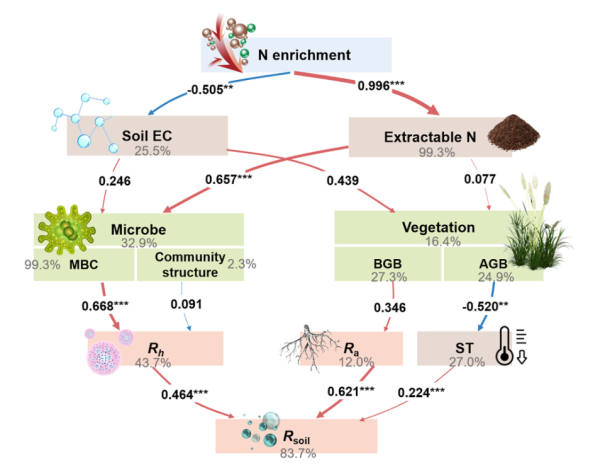 图4.结构方程模型(SEM)描述了富氮对土壤呼吸(Rsoil)的影响机制