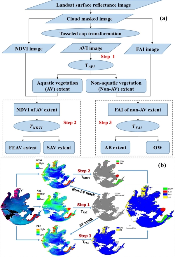 图1.水生植被和藻华(VBI)遥感识别算法流程(a)和太湖案例(b);注:AB:藻华;FEAV:挺水/浮叶植被;SAV: 沉水植被。