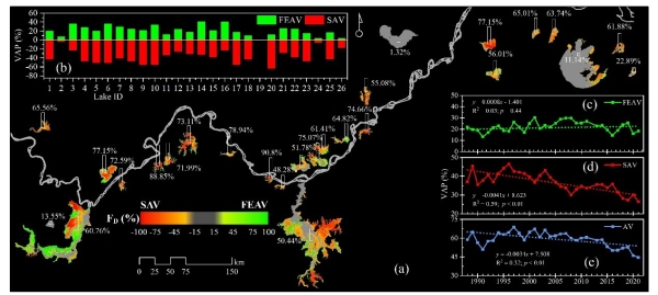 图2.长江中下游湖泊(> 50km2)水生植被时空分布及变化趋势