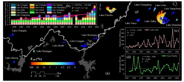 图3.长江中下游湖泊(> 50km2)藻华时空分布频率及其变化